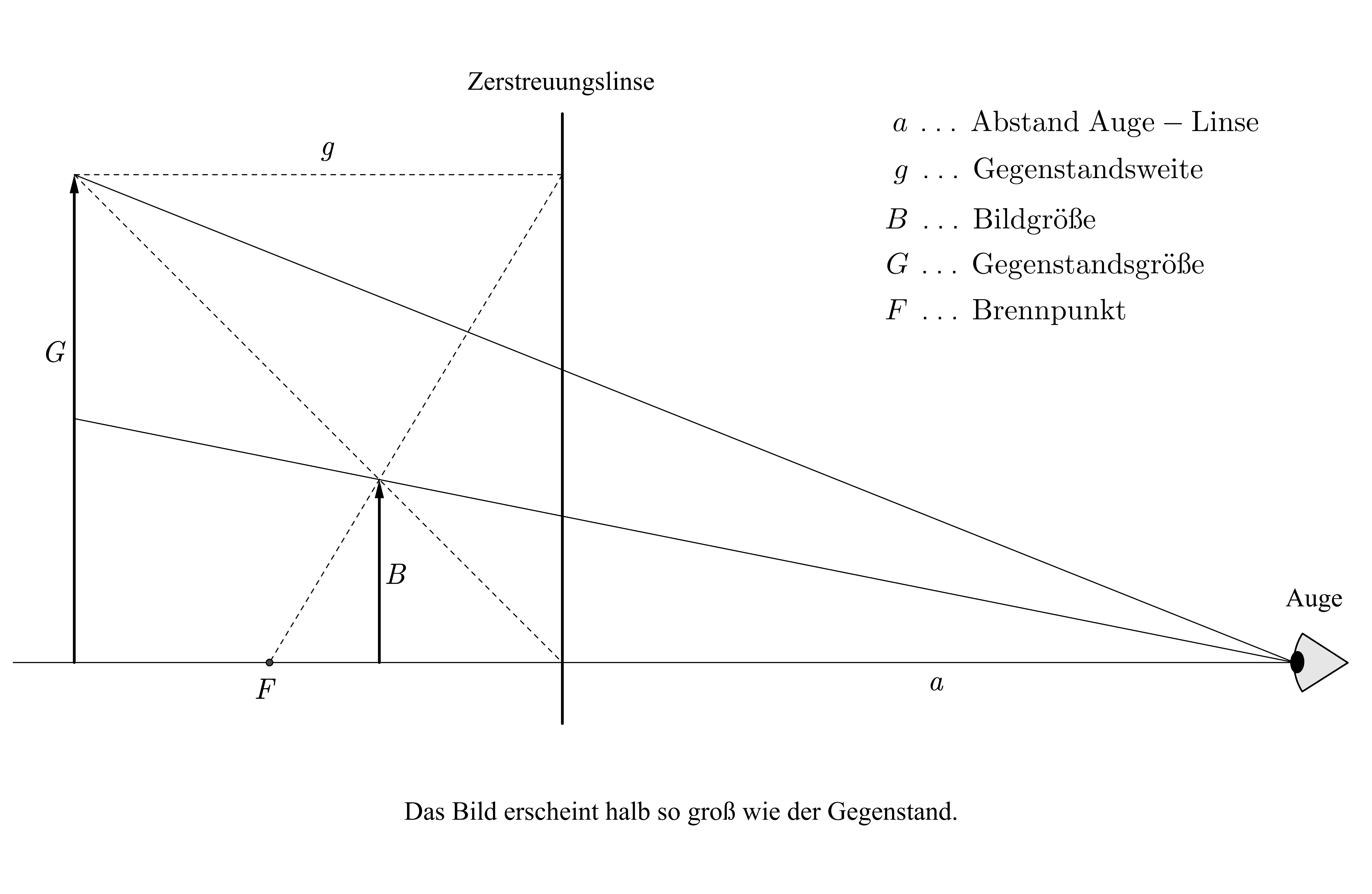 Nimm eine Brille für Kurzsichtigkeit und betrachte damit liniertes Papier. Variiere den Abstand deines Auges zur Brille so lange, bis der Linienabstand, den du durch die Linse beobachtest, genau halb so groß wie der Linienabstand außerhalb der Linse erscheint. Bestimme bei dieser Konfiguration den Abstand deines Auges zur Linse und den Abstand zwischen Papier (Gegenstand) zur Linse.