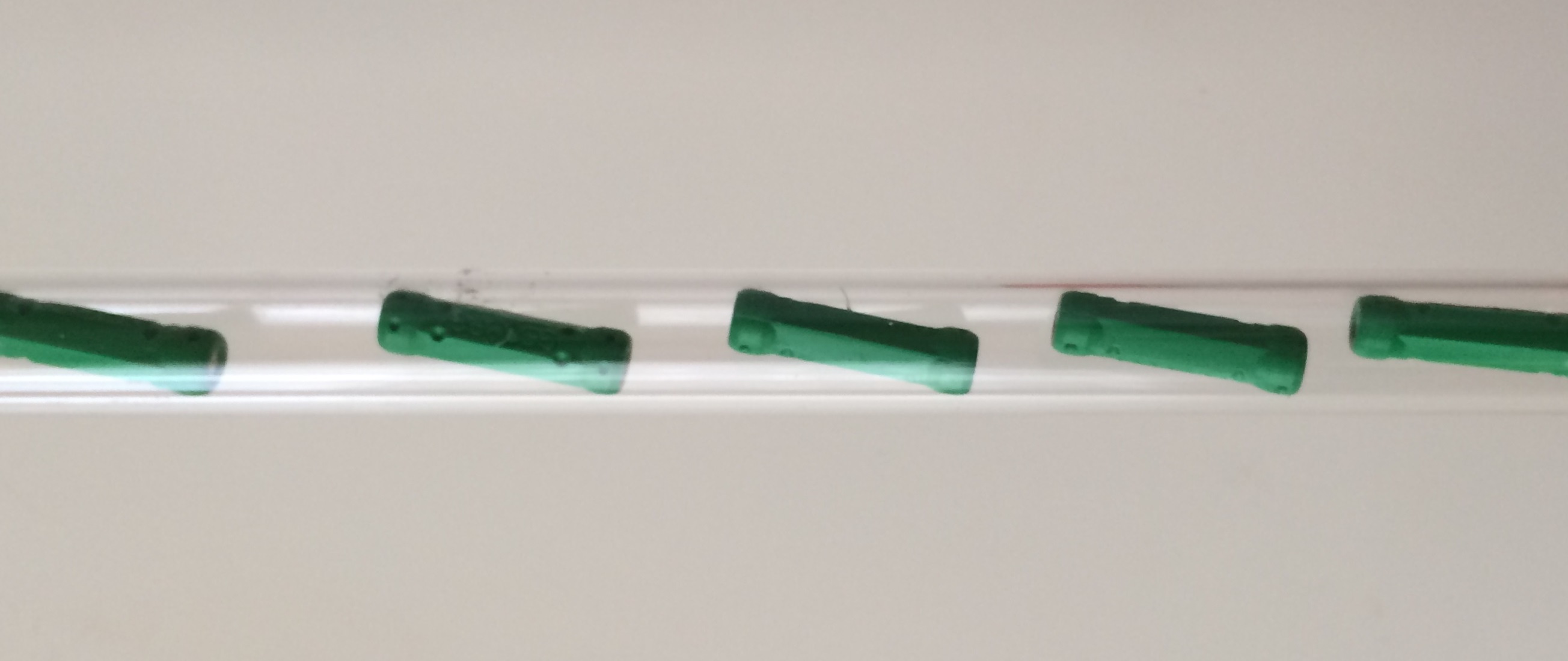 Ein durchsichtiges Plastikröhrchen habe ich mit fünf gleichartigen Magnetstäbchen so befüllt, dass sich die Magnete gegenseitig abstoßen.